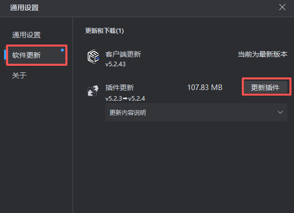 - 请进入客户端的【设置】→【软件更新】页面,点击更新插件。更新完成后,重启客户端与 3ds Max 。