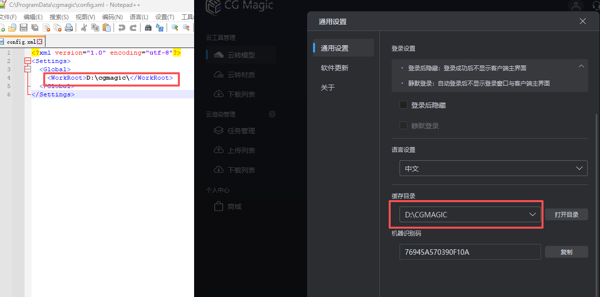 %programdata%/cgmagic/config.xml文件中的内容和客户端缓存地址示意图: