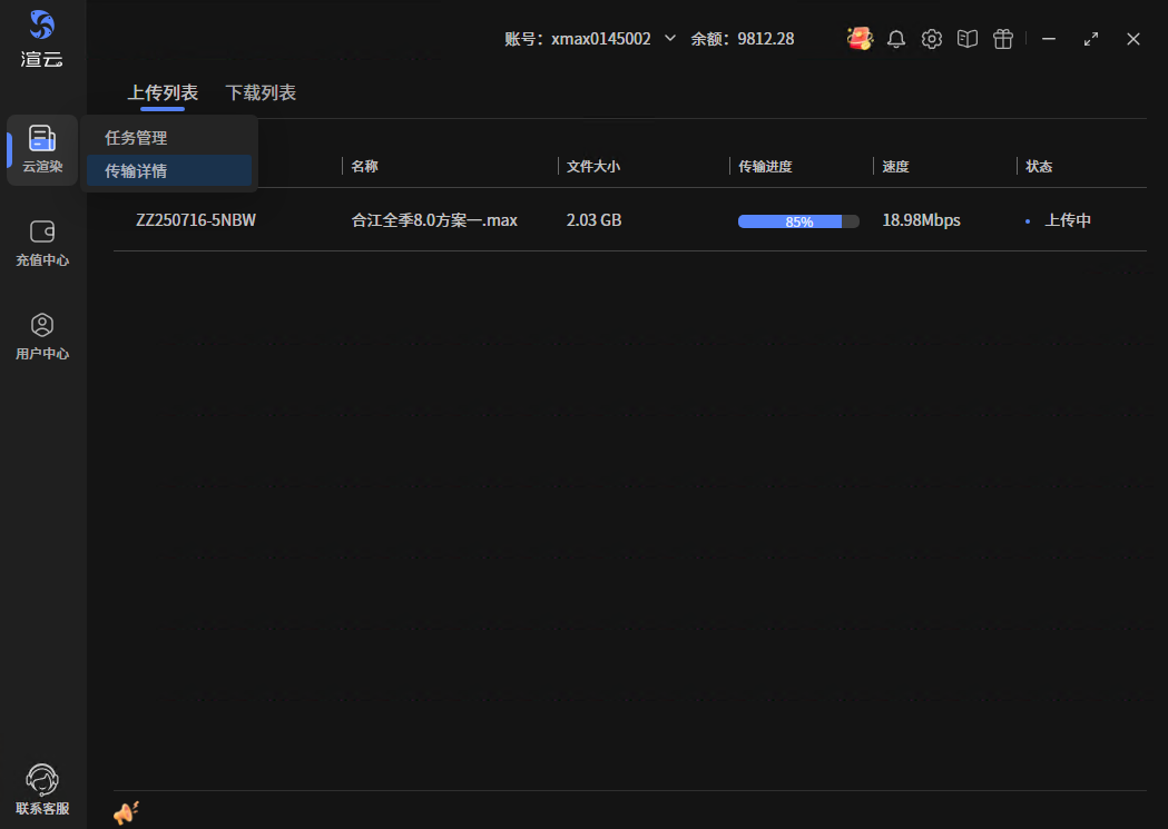 鼠标悬停在“云渲染”按钮上,出现二级菜单,选择“传输列表”,进入后,默认显示的就是上传详情。