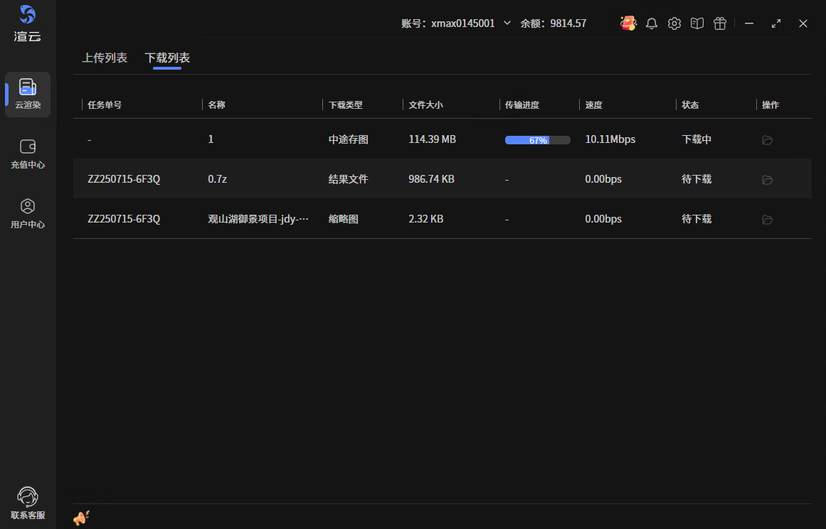 鼠标悬停在“云渲染”按钮上,出现二级菜单,选择“传输列表”,进入后默认是“上传列表”,我们需要手动切换到“下载列表”