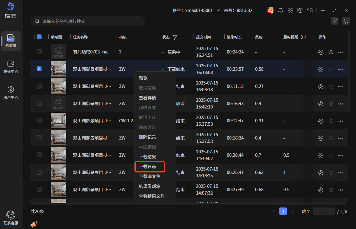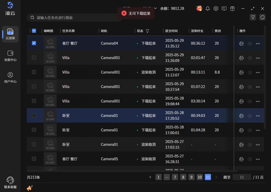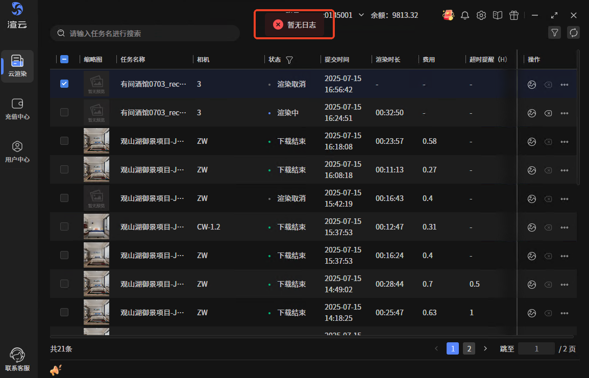 - 短时间取消或失败的,还没到渲染环节的,没日志。没日志的任务,操作下载日志时,会提示暂无日志。日志被清理后再下载的,同样会提示暂无日志