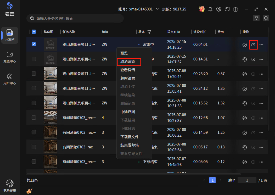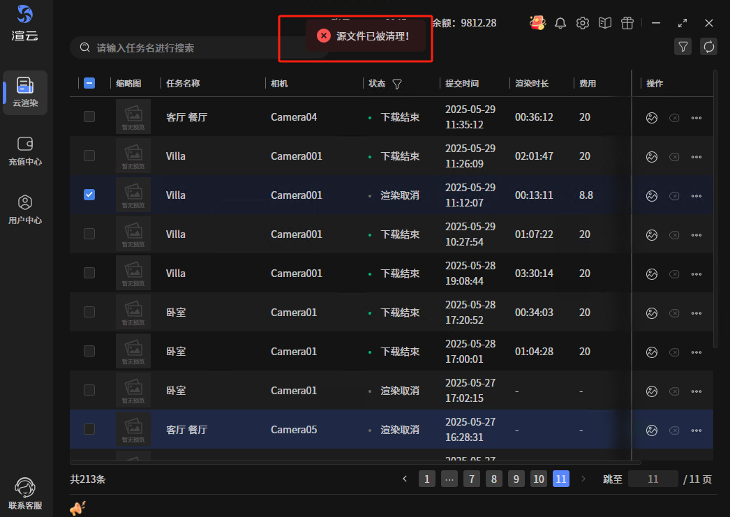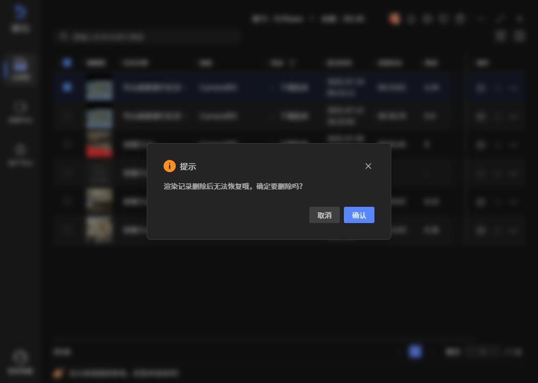 已完成的任务记录可被删除,状态包含:上传取消、上传失败、渲染成功、渲染失败、渲染取消和下载结束,支持批量操作。批量操作时,选中任务中有一个不是以上状态的,则“删除记录”按钮置灰 记录删除后不能再恢复,操作时会有确认框,确认后删除