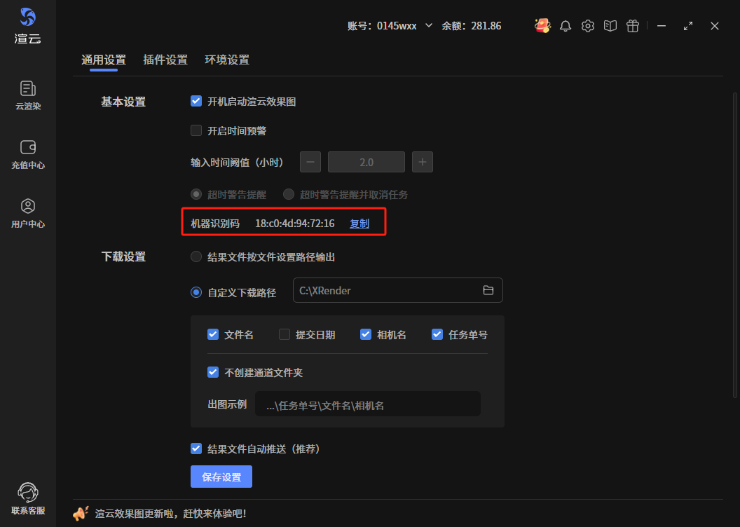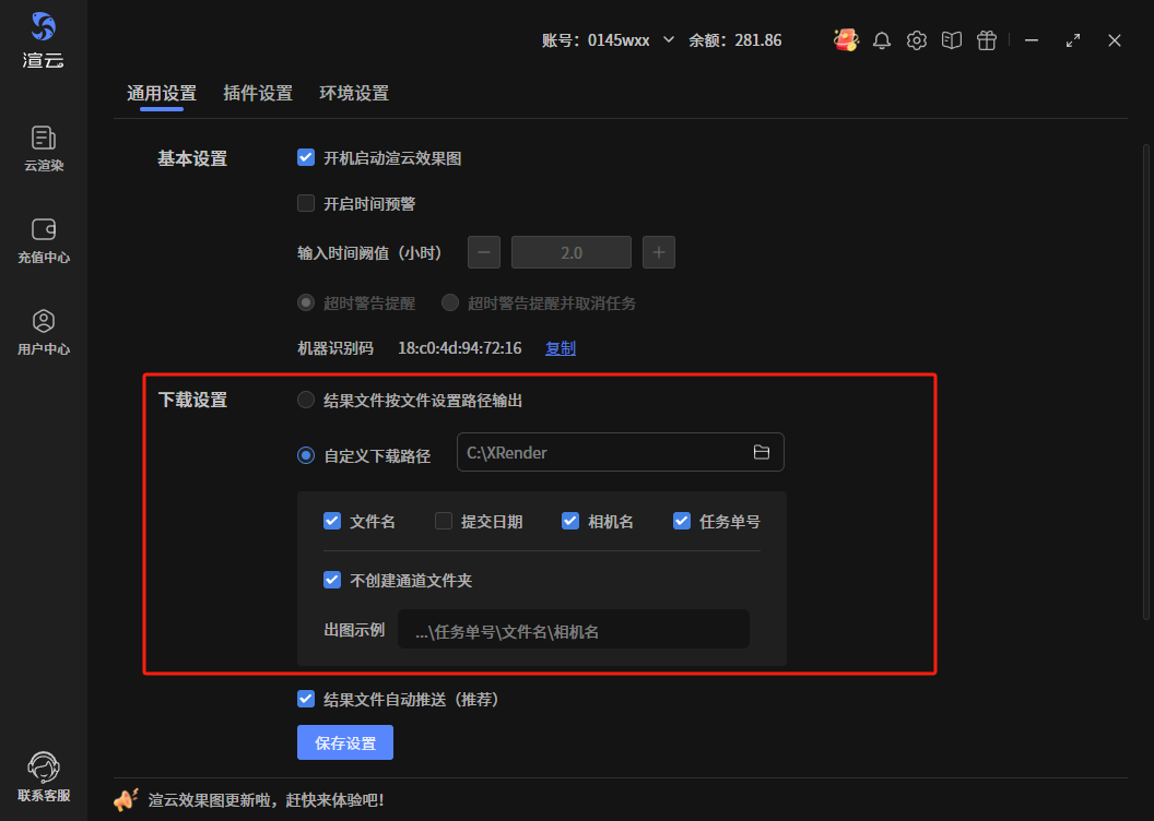 - 自定义下载路径:默认下载在C:\Xrender路径下,每个任务会以任务单号\文件名\相机名的结构出图,有通道默认不创建通道文件夹。用户可根据自己的需求去修改设置项。“文件名”、“提交日期”、“相机名”、“任务单号”四个配置项是按启用顺序觉得目录结构,先勾选的在前面,后勾选的在后面。搞不清楚的,可看出图示例