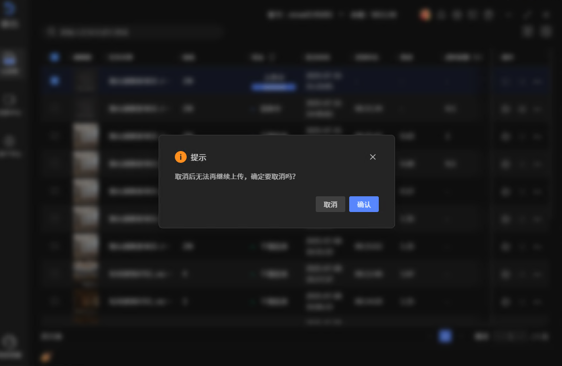 待上传、上传中的任务支持取消上传。右键选择“取消上传”按钮,有弹框确认,确认后,任务取消上传