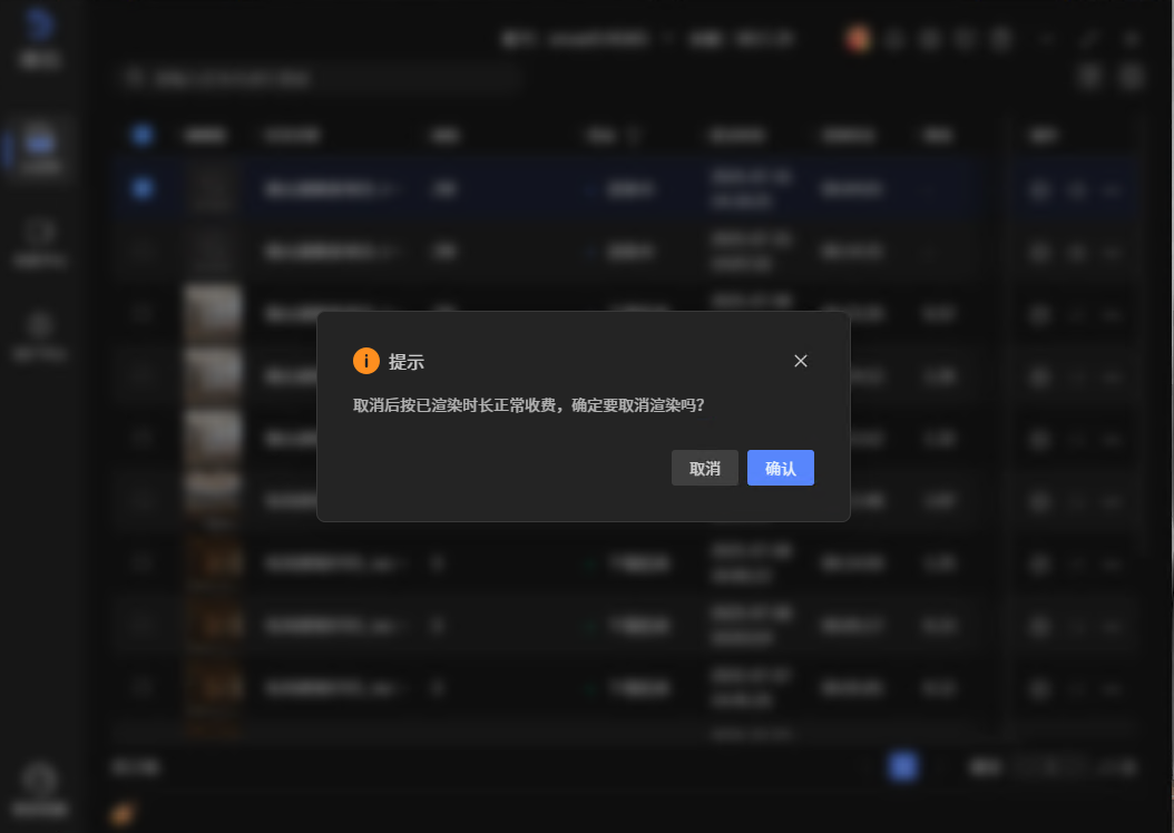 渲染中、处理中的文件支持取消渲染,两个地方操作。一是右键菜单,选择“取消渲染”按钮,二是列表操作下面,第二个按钮,直接点击取消。取消时会有确认框提醒,确定之后任务取消。