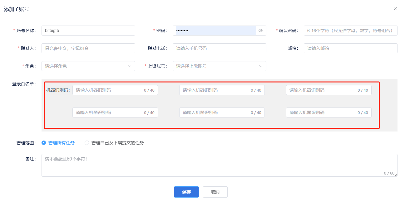 - 子账号创建时,将机器识别码贴入子账号登录白名单内