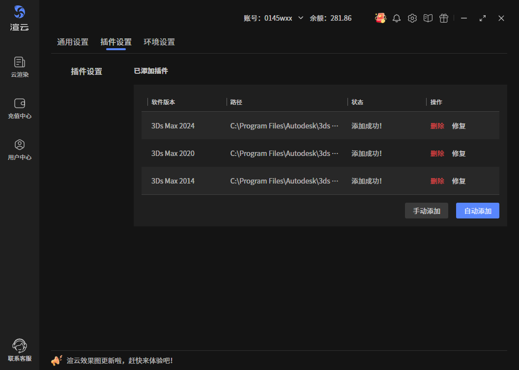 插件列表,展示用户本地有哪些max版本安装了渲云插件。已安装的可删除,插件不能用了可修复。若先安装的客户端后安装的max软件,可点击“自动添加”按钮,一键添加插件;若用户本地的max软件不是按默认路径安装的,可点击“手动添加”按钮,浏览本地max安装目录,添加插件