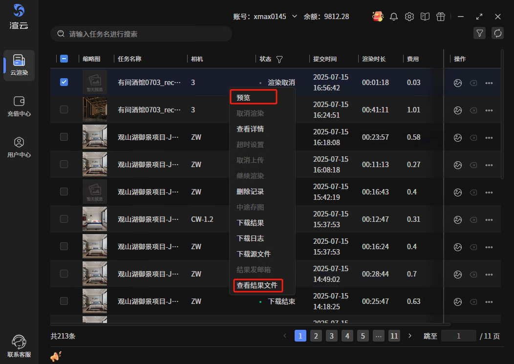渲染取消和下载结束的任务支持查看结果文件,右键菜单选择“预览”或“查看结果文件”按钮则开打开出图目录,查看结果。另外,操作下的第一个图标,点击后也可打开出图目录,查看结果