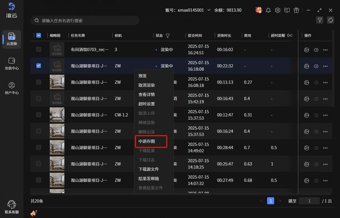 渲染中的任务支持在渲染过程中将已渲染到一半的图保存出来。右键菜单选择“中途存图”按钮,操作后服务端开始保存中间文件,保存后自动下载到出图目录的“middle_store”文件夹中,下载完成后自动打开出图目录。若通用设置中关闭下载完成后自动打开出图目录,则不会打开出图目录。