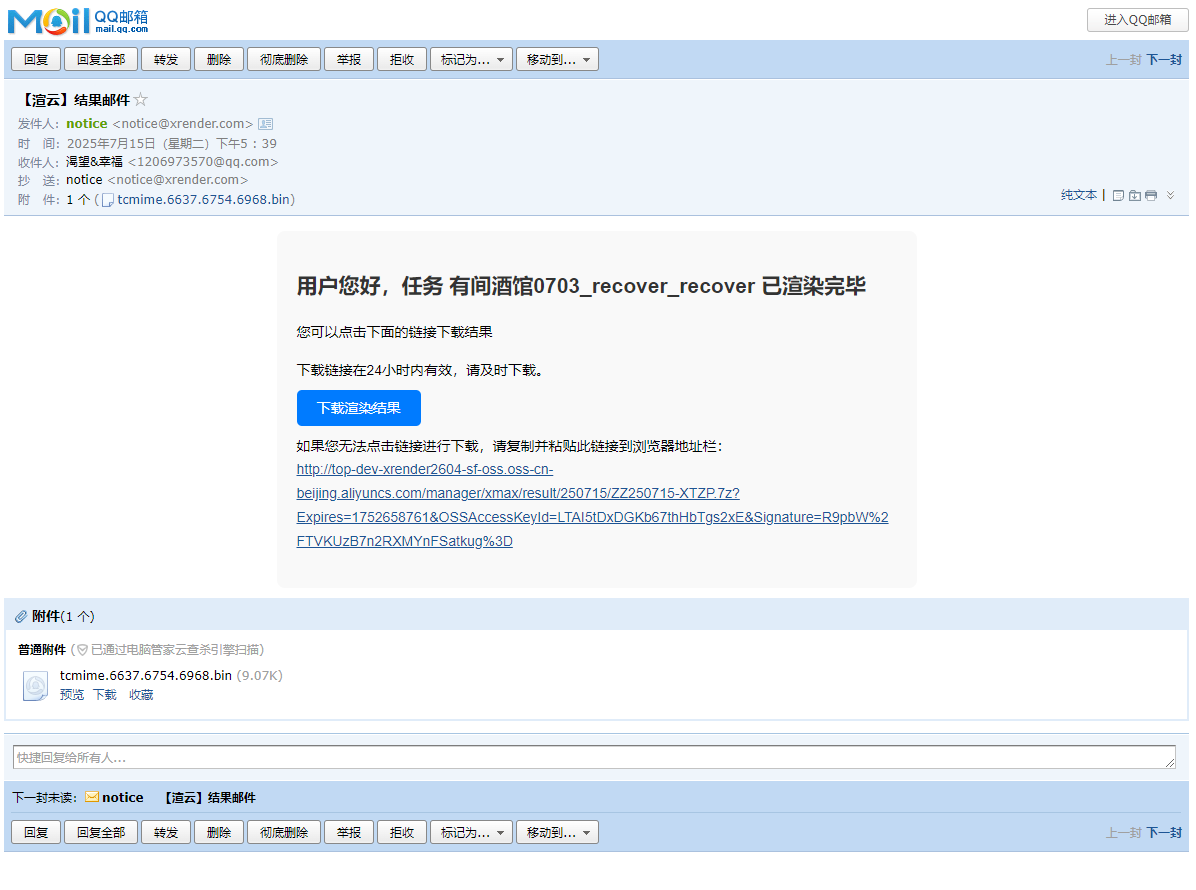 选择任务,右键菜单选择“结果发邮箱”,弹框设置邮箱地址,该地址只需设置一次,下次操作时会自动记住该邮箱,可修改。邮箱地址确认后,提交,待有渲染结果后,会直接将结果文件发送指定邮箱,此时屏幕右下角会有弹框提醒。 邮箱内,可直接点击下载按钮下载,若点击后无法下载的,可将下面的链接复制到浏览器内下载