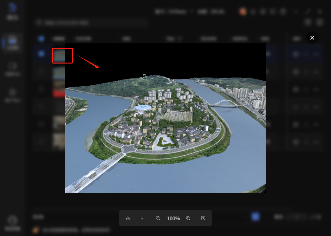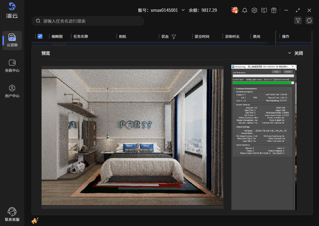 渲染中的任务支持预览查看当前的渲染效果,一般渲染时长超过5分钟之后才能预览到效果。预览界面包含两块内容,效果图和渲染进度,点击预览图片可放大查看内容。