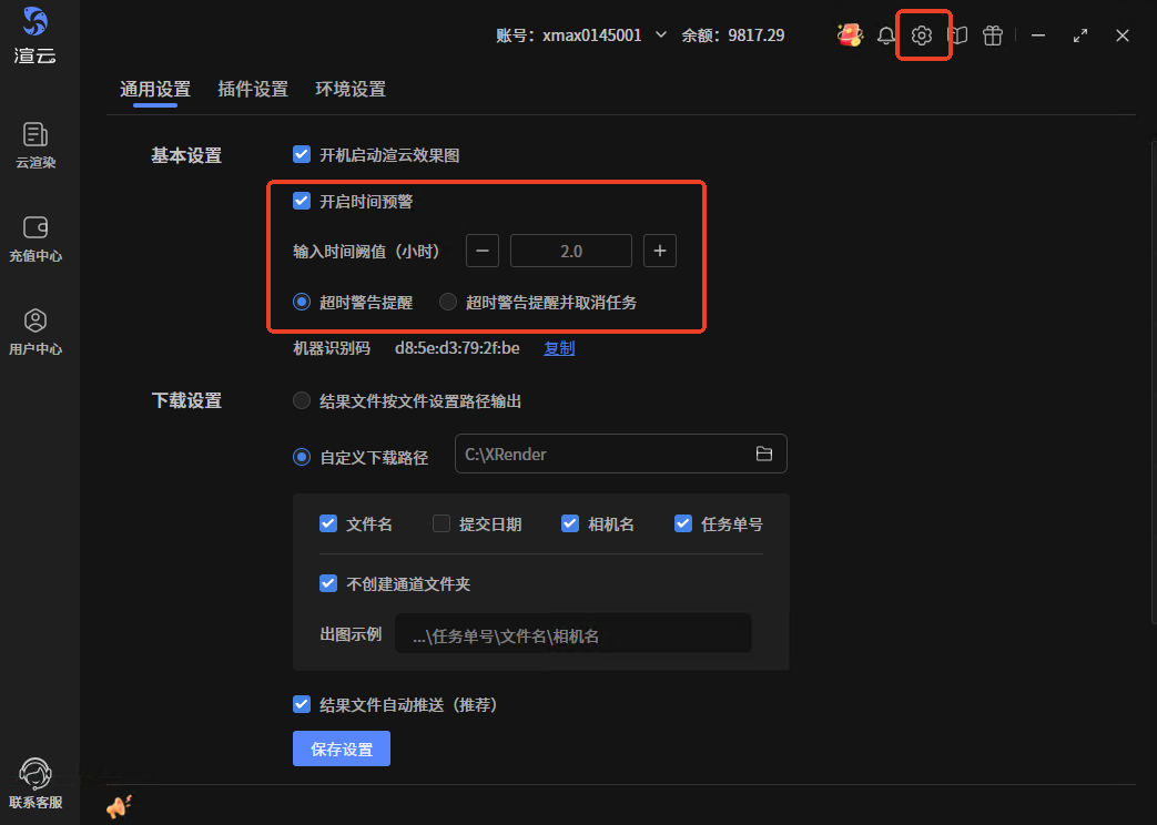 设置一定的渲染时长,超时后,在任务上做提醒,也可设置超时后自动取消渲染。设置分两块,通用设置里面全局设置,或单个任务独立设置。