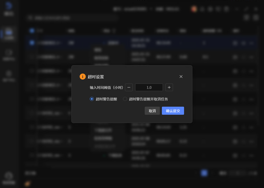 上传中、处理中、渲染中的任务,右键菜单选择“超时设置”,弹框页面设置提醒时间及超时后的处理,默认情况下,只提醒不取消,需要取消的,选择“超时警告提醒并取消任务”