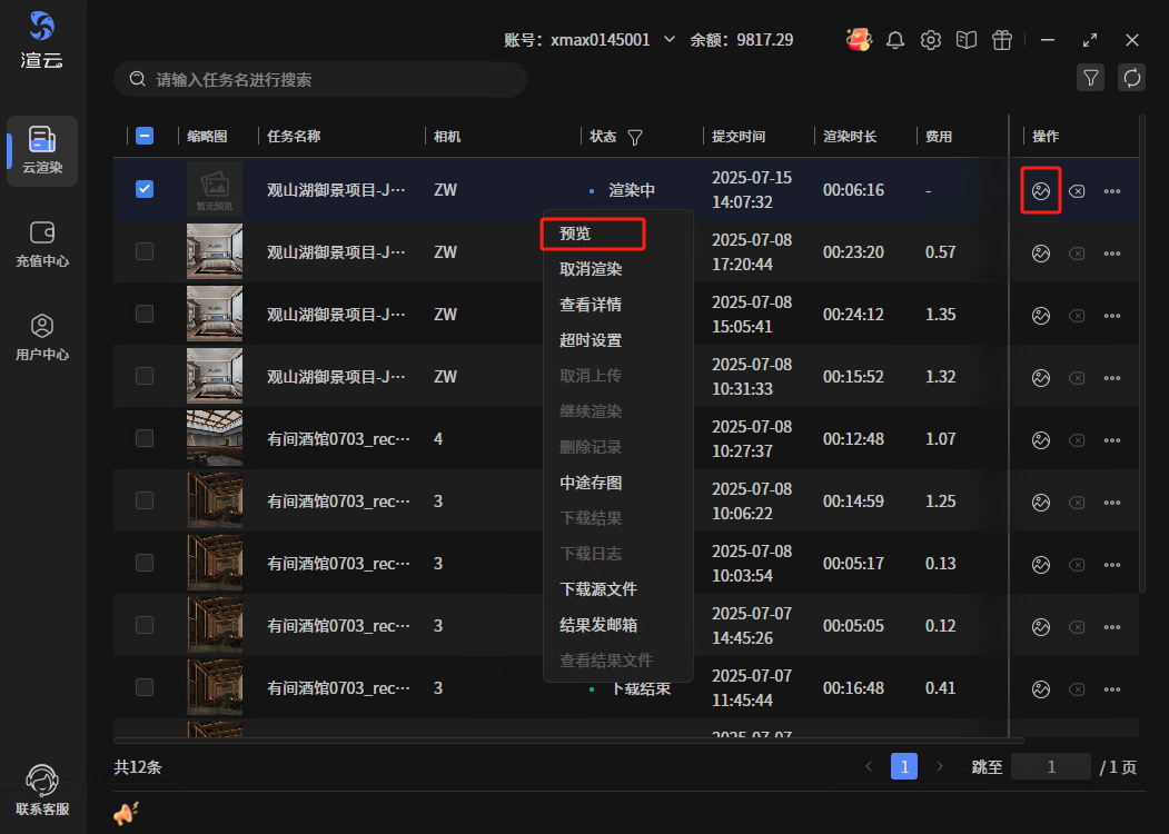 预览入口有两处,右键菜单,选择“预览”按钮可打开预览页面,列表操作图标第一个,点击,也可打开预览界面。此处两个入口,在渲染过程中点击是打开预览页面,若是渲染完成后点击,则是打开出图目录