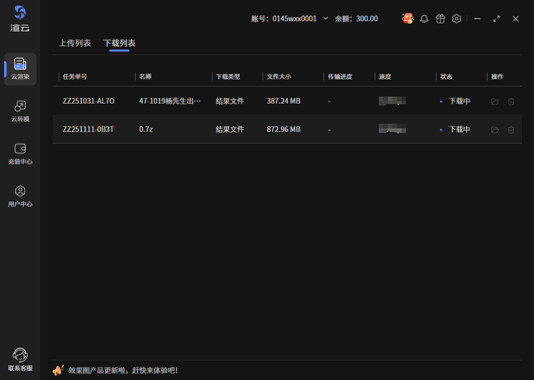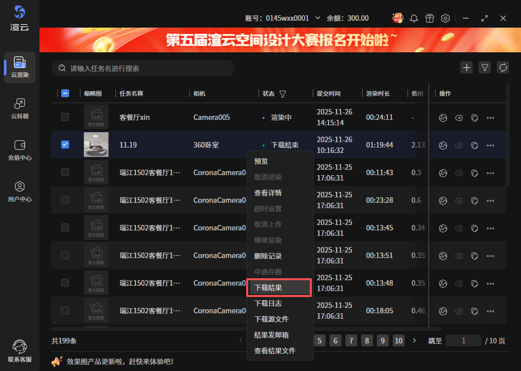 - 结果文件默认渲染自动下载。若本地未找到,可以选中任务右击“下载结果”尝试再次下载,如截图所示