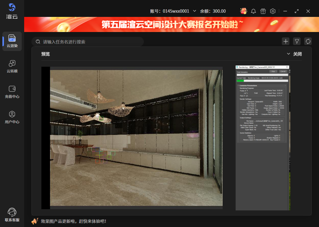 - 渲染中的任务支持预览查看当前的渲染效果,一般渲染时长超过5分钟之后可以预览到效果。预览界面包含两块内容,效果图和渲染进度,点击预览图片可放大查看内容