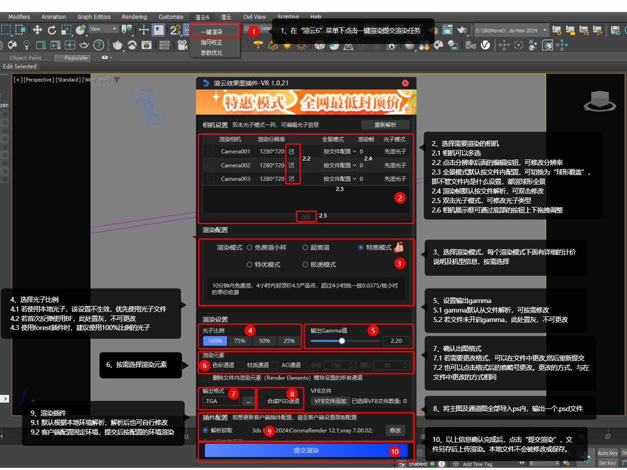 在“渲云6”菜单下点击“一键渲染”提交任务