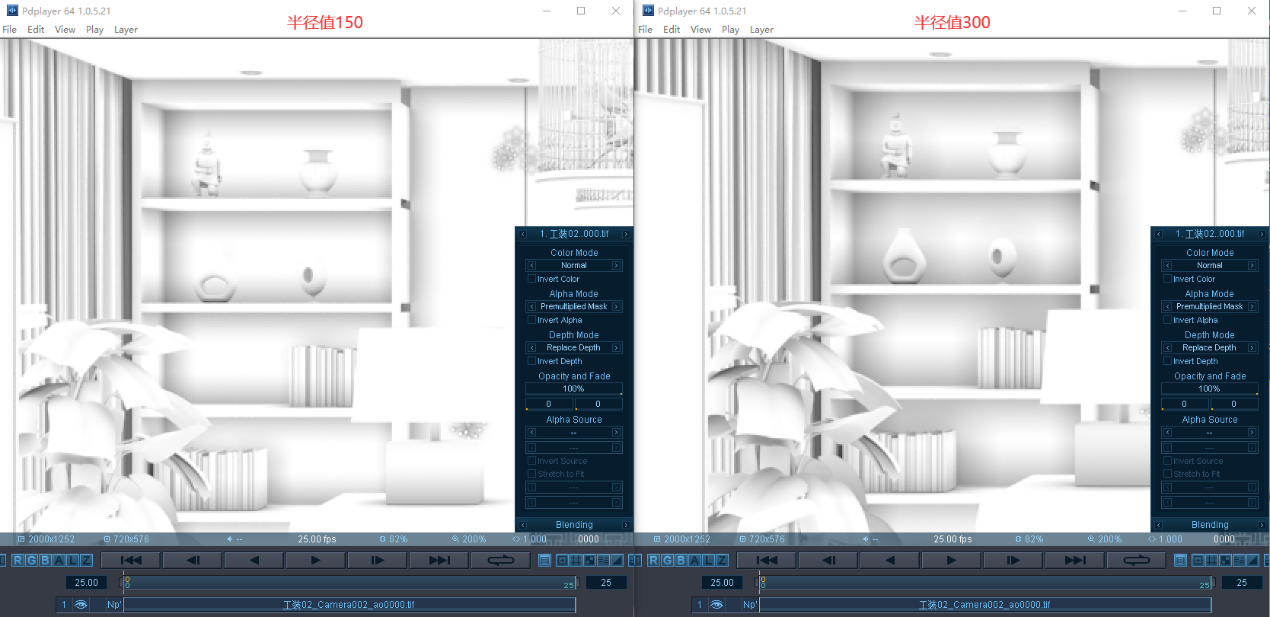- ii. AO通道支持修改半径值和细分值。其中半径值越大,线条阴影效果越重,如截图所示,AO通道效果同时受到文件单位设置影响(厘米、米、英寸等)