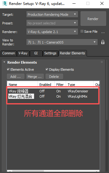 - 删除文件内渲染元素模块设置的所有通道:将文件内Render Elenents模块添加的通道全部删除
