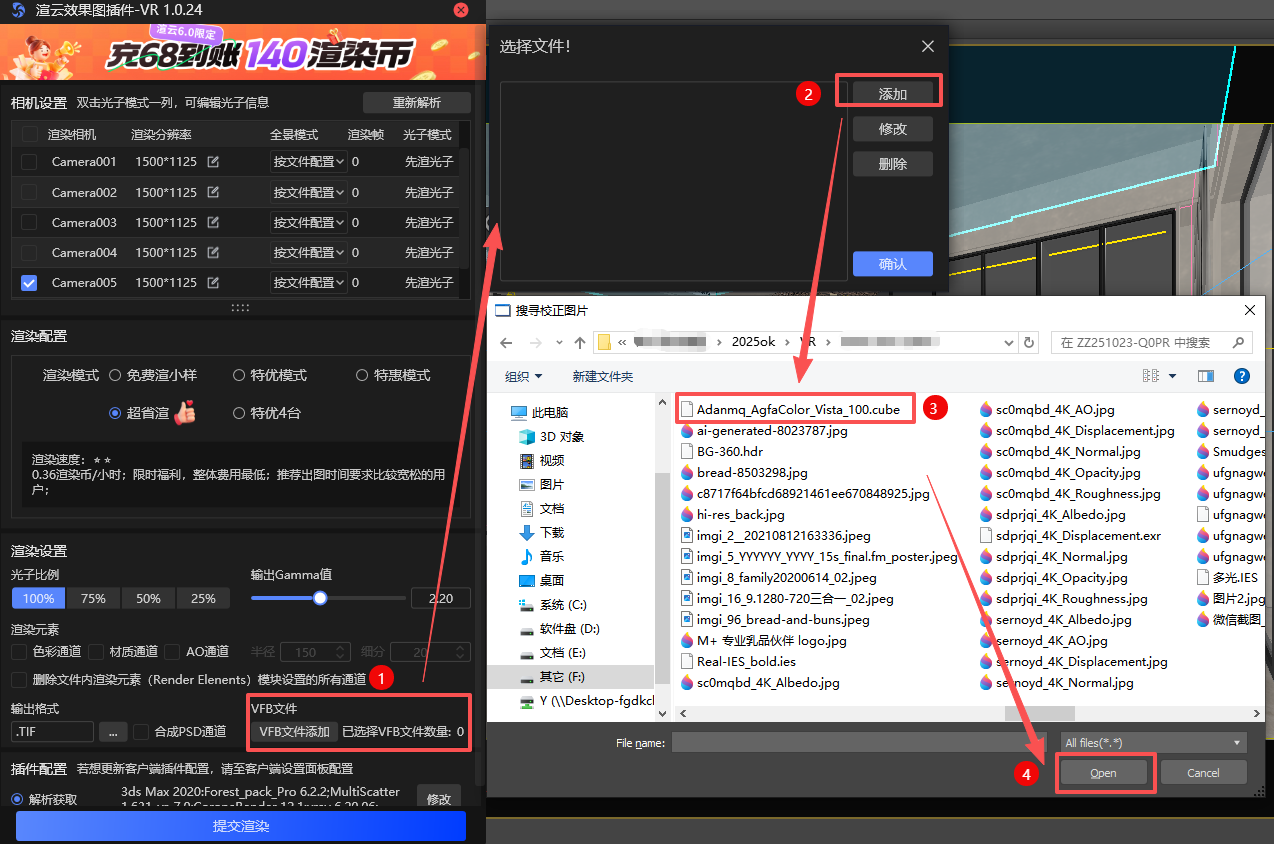 - ii. vray的5.0版本,及vray5.1中的vray5.10.00版本中存在的接口错误问题,导致以上版本获取不到VFB窗口中指认的外部资产文件,如lut文件,此时需要通过该功能,人工指认资产文件,否则相应资产无法上传,影响最终渲染效果