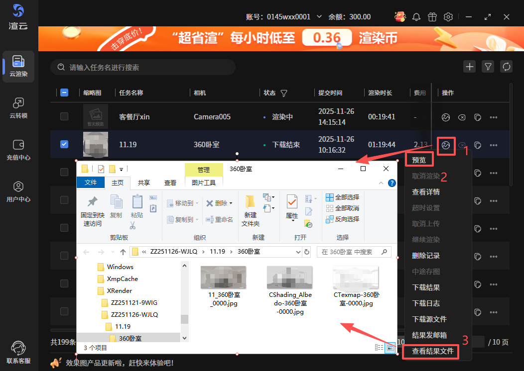 - 对于渲染完成的任务,右击任务选择“预览”或点击操作下的预览图标,功能等同于“查看结果文件”