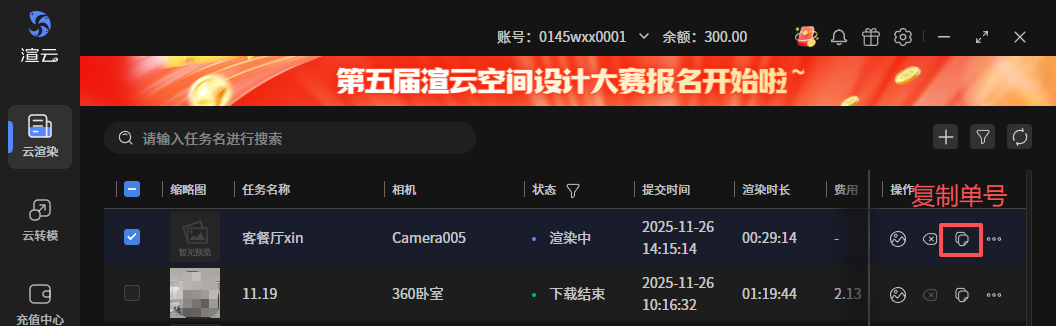 如果您对已经提交的订单有任何疑问,可以在操作下点击复制按钮,将任务的渲染单号通过各种沟通渠道反馈给我们,我们将及时处理您反馈的问题